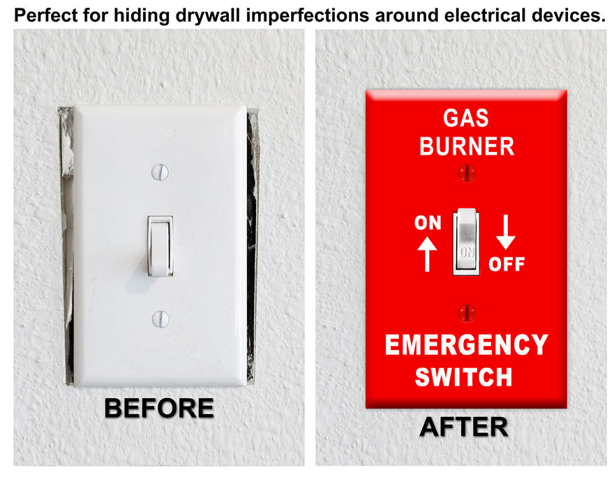 • Cover Blemishes - The larger 5.5 x 3.5 inch dimensions of the single gang Oversized Jumbo toggle style emergency gas shut off wall plate helps hide unsightly blemishes and old paint left behind from old switch plate covers and help cover large electrical box openings. Gloss red painted finish and printed white lettering protects from abrasions and scratches. Color matched screws included.