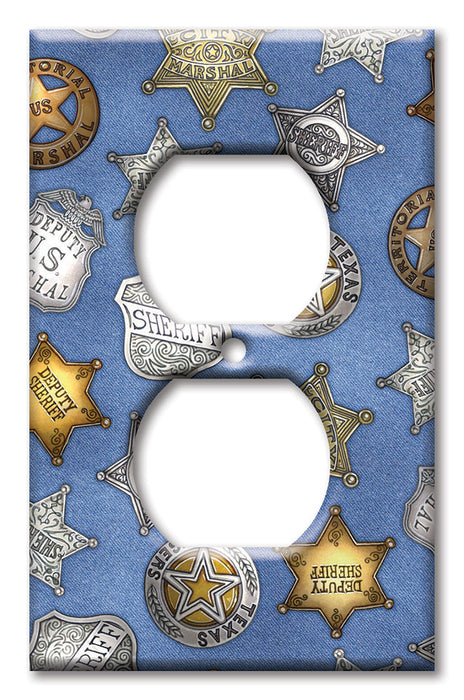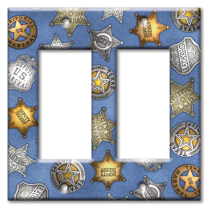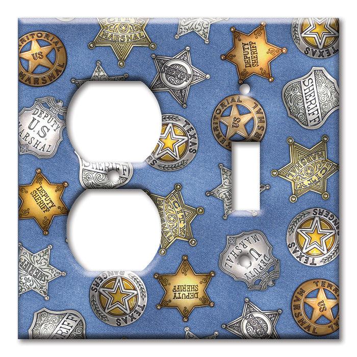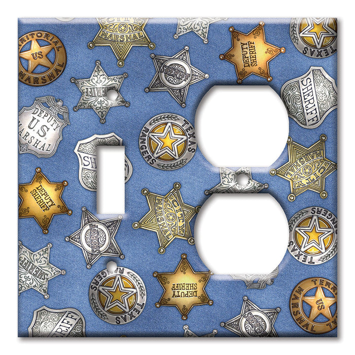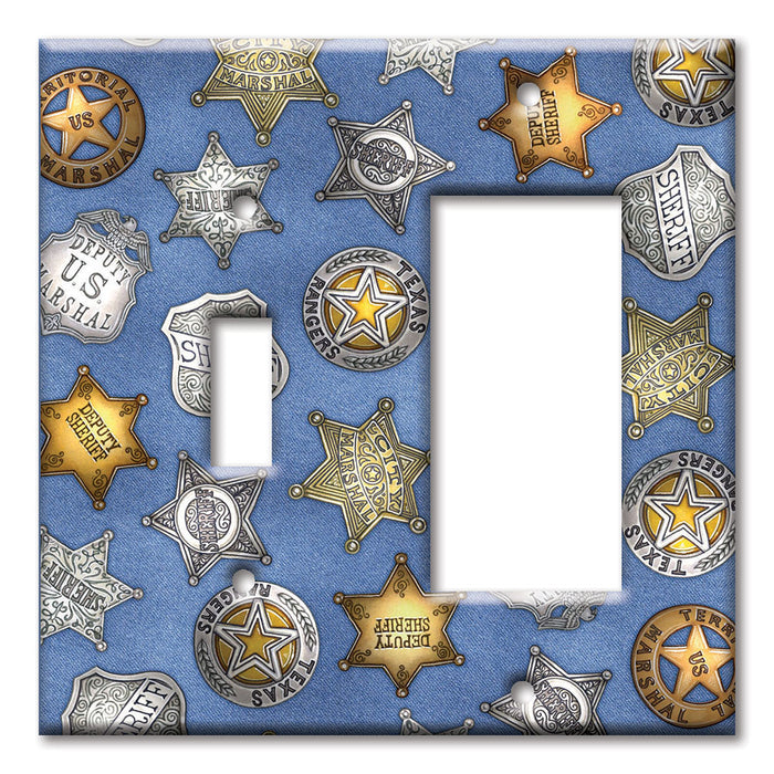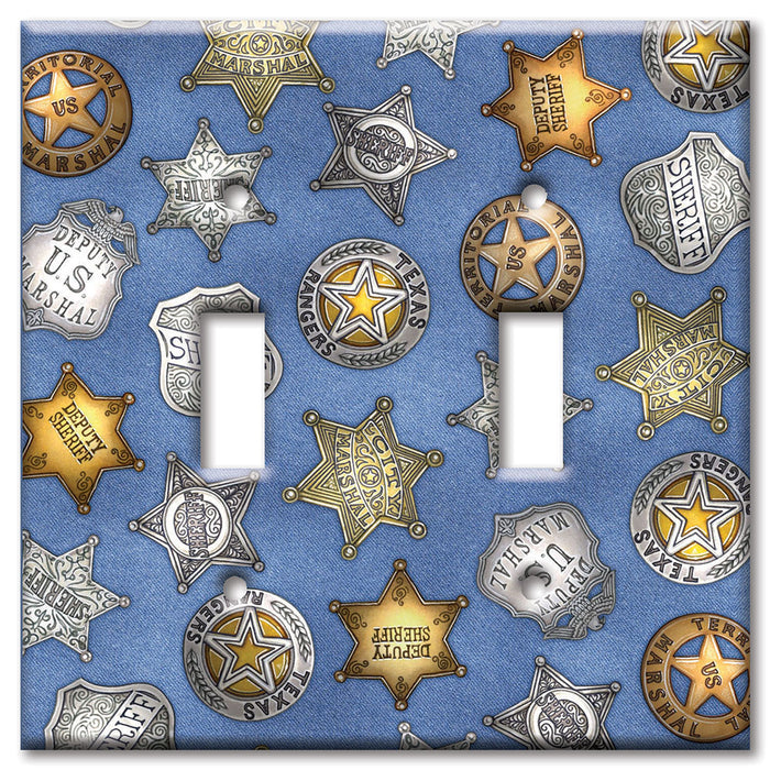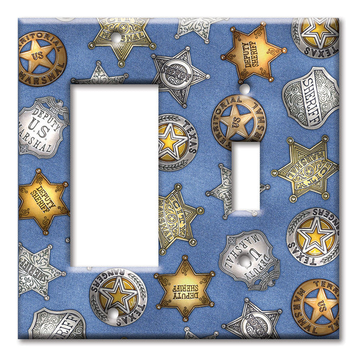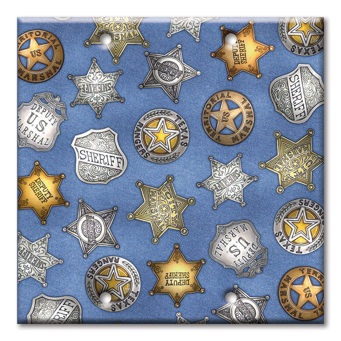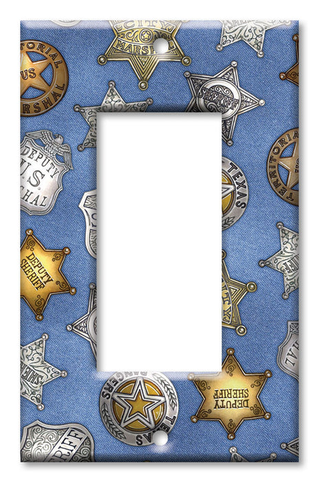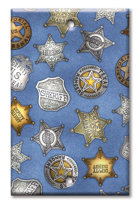 Decorative Printed OVERSIZED Switch Plate - Electrical Switch Cover JUMBO Wall Plate by Art Plates - Sheriff Badges (Denim) - Image by Dan Morris - 1 Gang Toggle